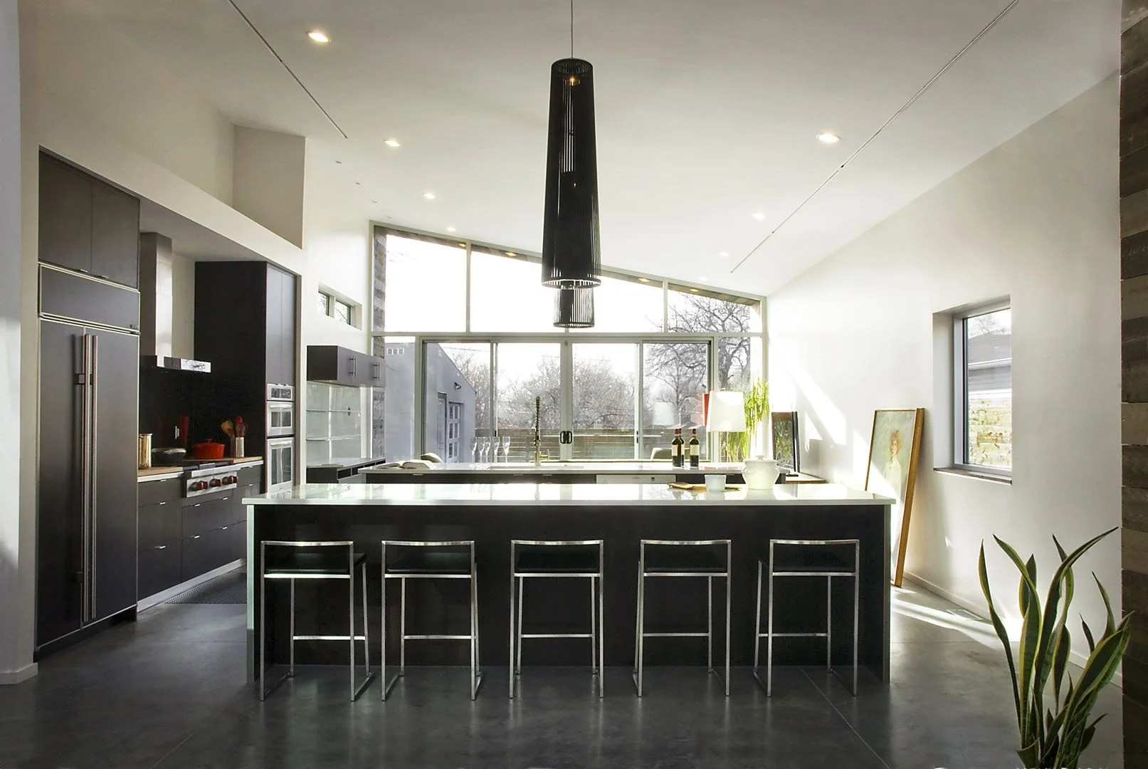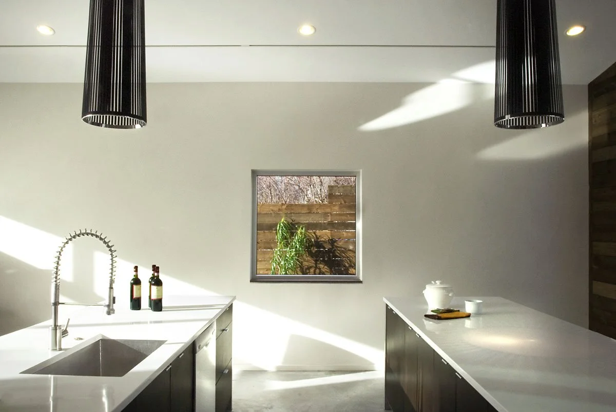 With few appealing exterior views, the lot's new home now creates it's own internal views. At the center of the home is an all glass, open-to-the-air courtyard entirely enclosed by private spaces on one side and public on the other.