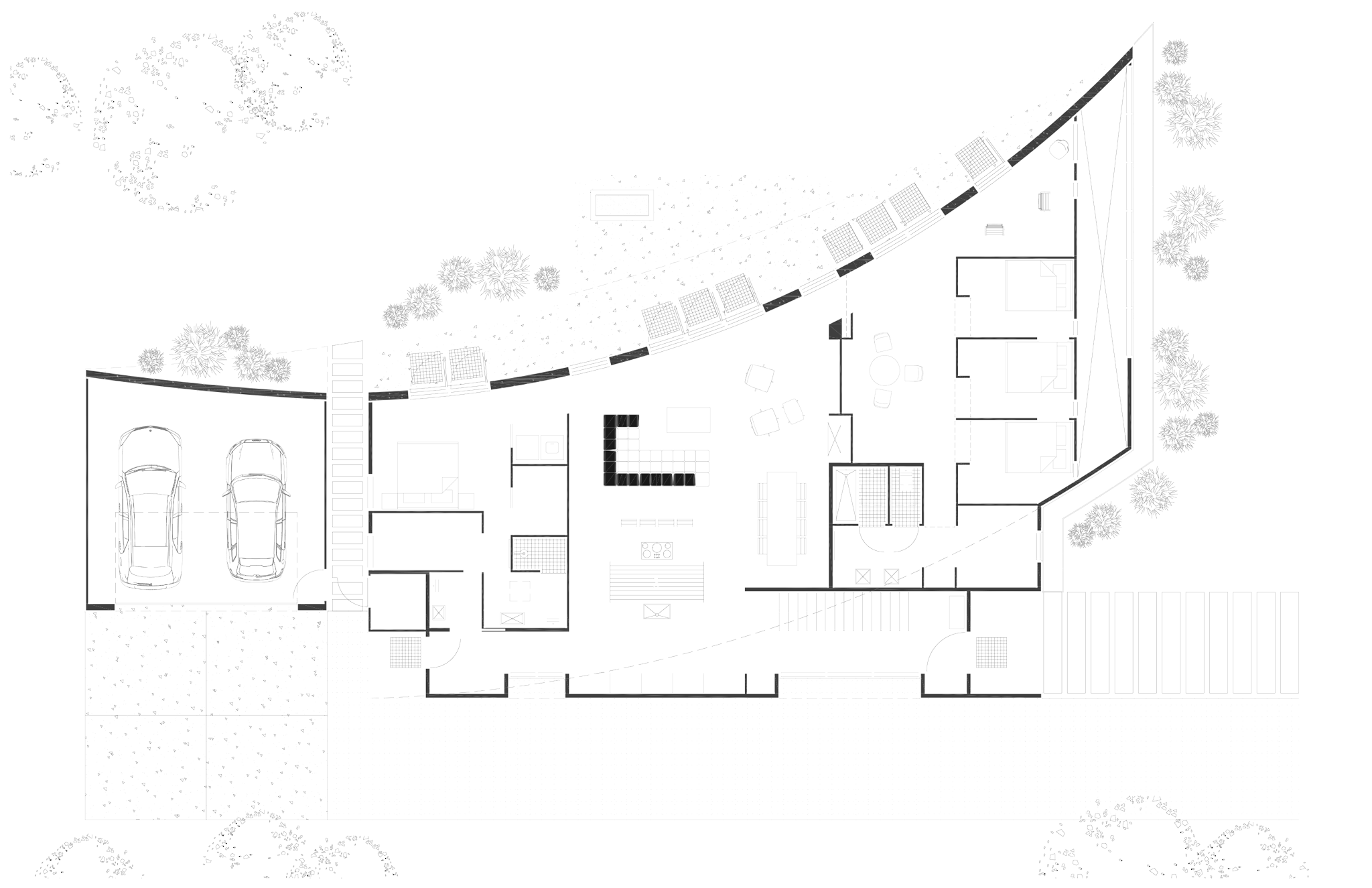 a curving concrete wall defining an outdoor space
