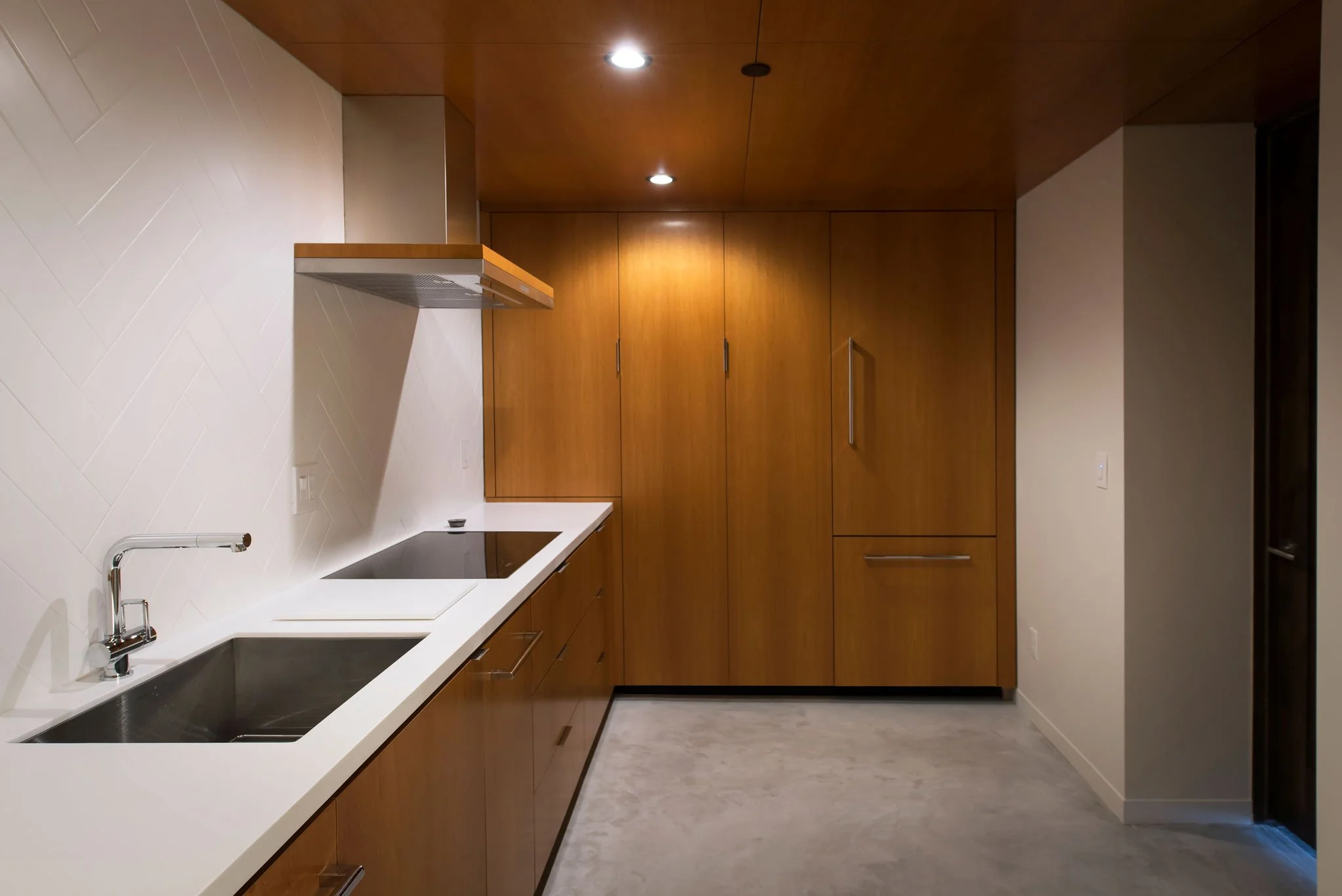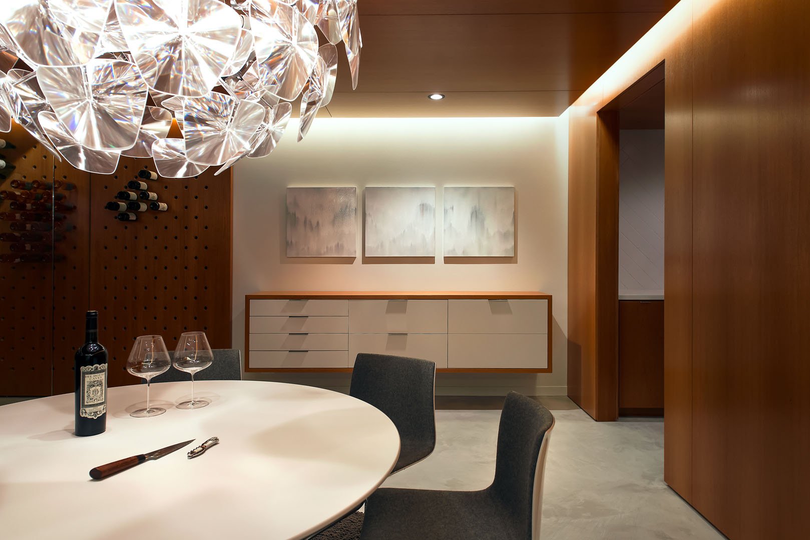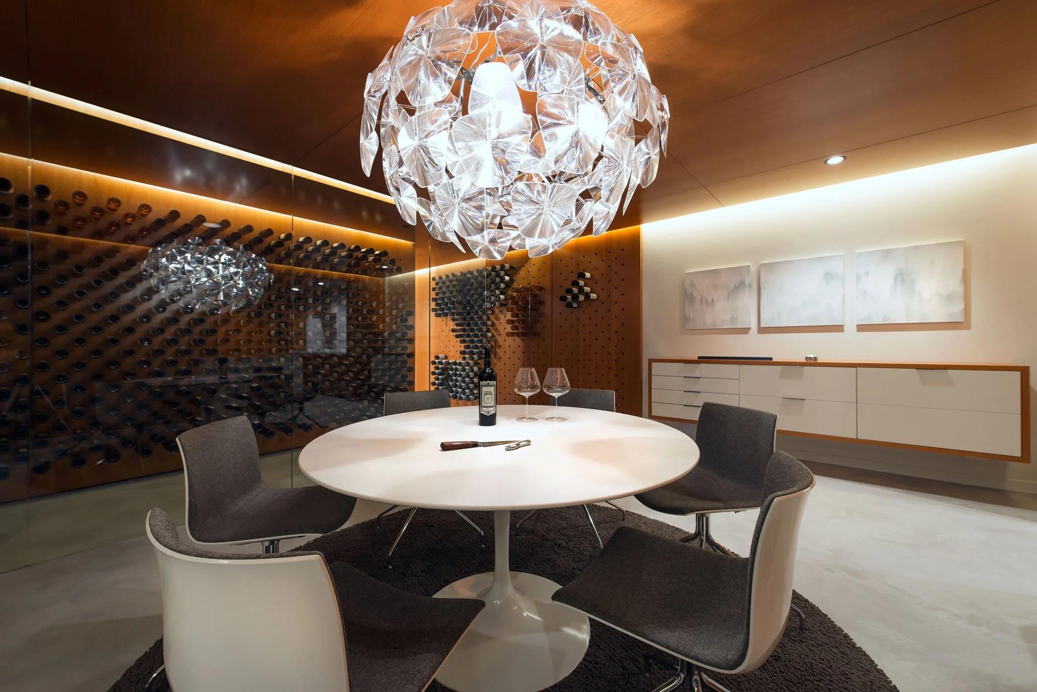 Clad in custom flitch-matched mahogany millwork by Fondell Woodwork, the 1,500 bottle storage walls display the wine in a cantilevered fashion for easy access and a bit of imbue ingenuity - behind the scenes shelving hold the remainder of the cache.