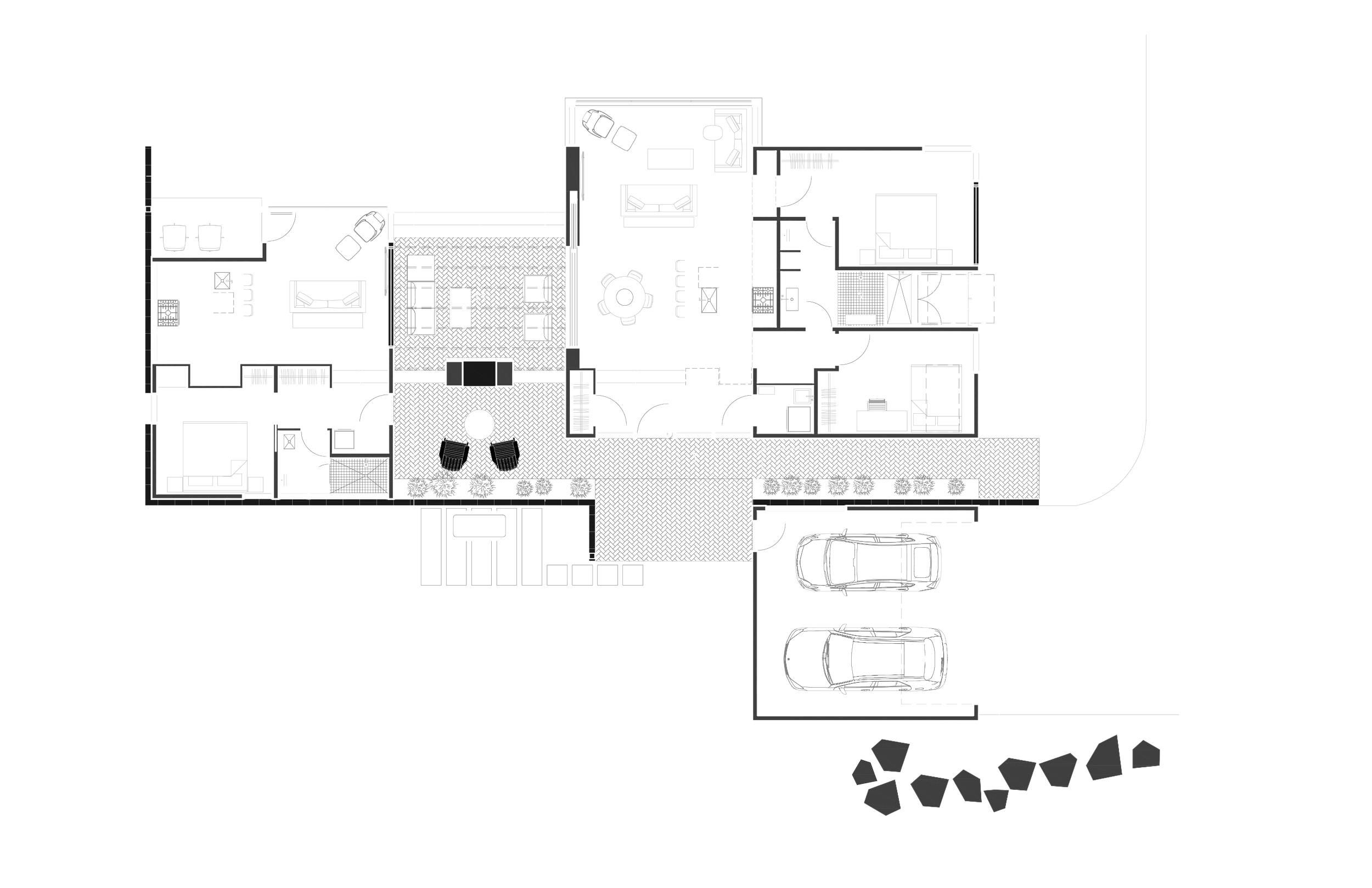 The program consists of a residence, a casita and a ping pong court [aka garage], embraced by roughly hewn desert red concrete block and organized around a courtyard. Where the concrete wall is the spine, the courtyard is the heart. A semi-private space where occupants come to eat, rest and connect over shared tales of adventure.